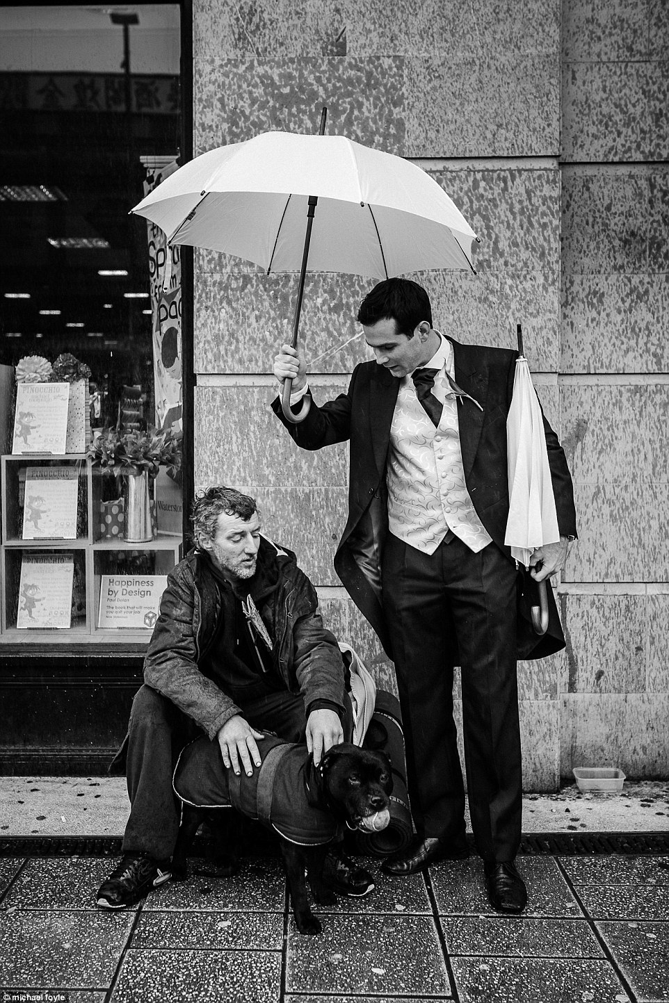 迈克尔·弗勒(Michael Foyle)的这张照片是他在南安普顿(Southampton)拍摄婚礼时所拍摄的。照片中,一位伴郎为一位无家可归的人和他的狗遮雨,并邀请他们进入房间热热身子,把衣服晒干。