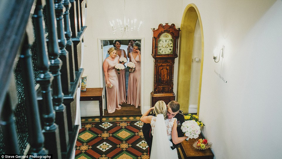 “这张照片是在新娘林赛前往教堂之前拍摄的。她的父亲身穿军装在楼梯下面等待着她,看着他的女儿长大成人。这是一个感动人心的时刻,特别是新娘当时的反应。我喜欢拍这样的时刻。”