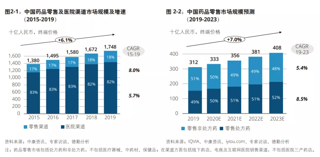 德勤报告显示,受带量采购扩面、医药分家深化、医保控费提速等政策影响,疫情前曾预测中国药品零售市场增速会放缓到5.5%,但由于新冠疫情爆发,反而加速了“处方外流”至院外渠道,预计2019-2023年的药品零售市场年复合增长率提升至7.0%,医药零售市场发展趋势继续昂首抬头,越早入局院外渠道部署,越对破解目前商业困局掌握主动权有利。