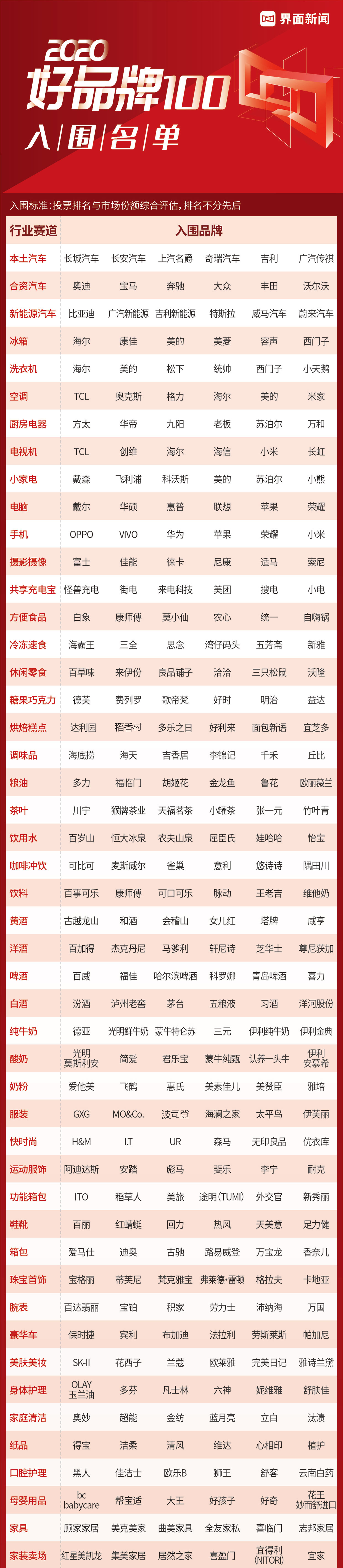 3个月的全网投票,经消费者的投票以及市场数据评估,现有 600个品牌脱颖而出,进入2020【好品牌100】入围品牌名单。界面新闻即日起对入围品牌予以公示,公示期间,欢迎公众对入围品牌进行监督。