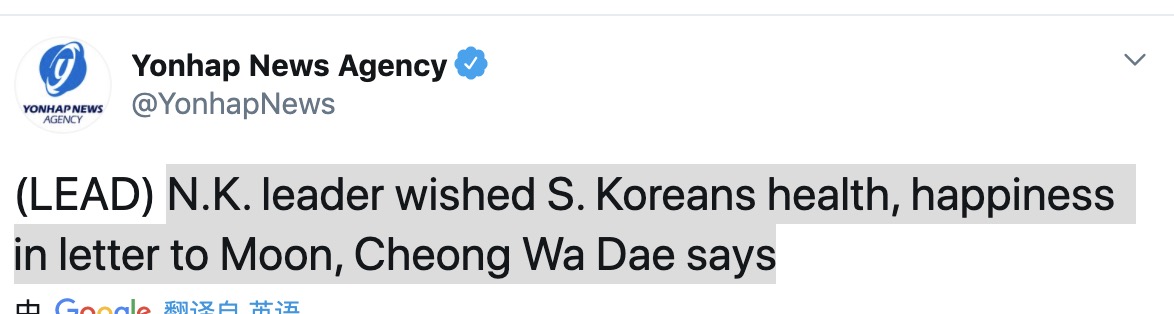 韩联社消息,韩国青瓦台称,朝鲜领导人向韩国总统文在寅致信,祝愿韩国人健康幸福。