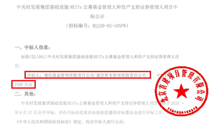 8月份有招标网站公布了“中关村发展集团基础设施REITs公募基金”的中标情况,建信基金及建信资本联合体中标了相关基础设施REITs项目,中标金额为2200万元,该项目的基础资产会否为产业园区尚未可知。