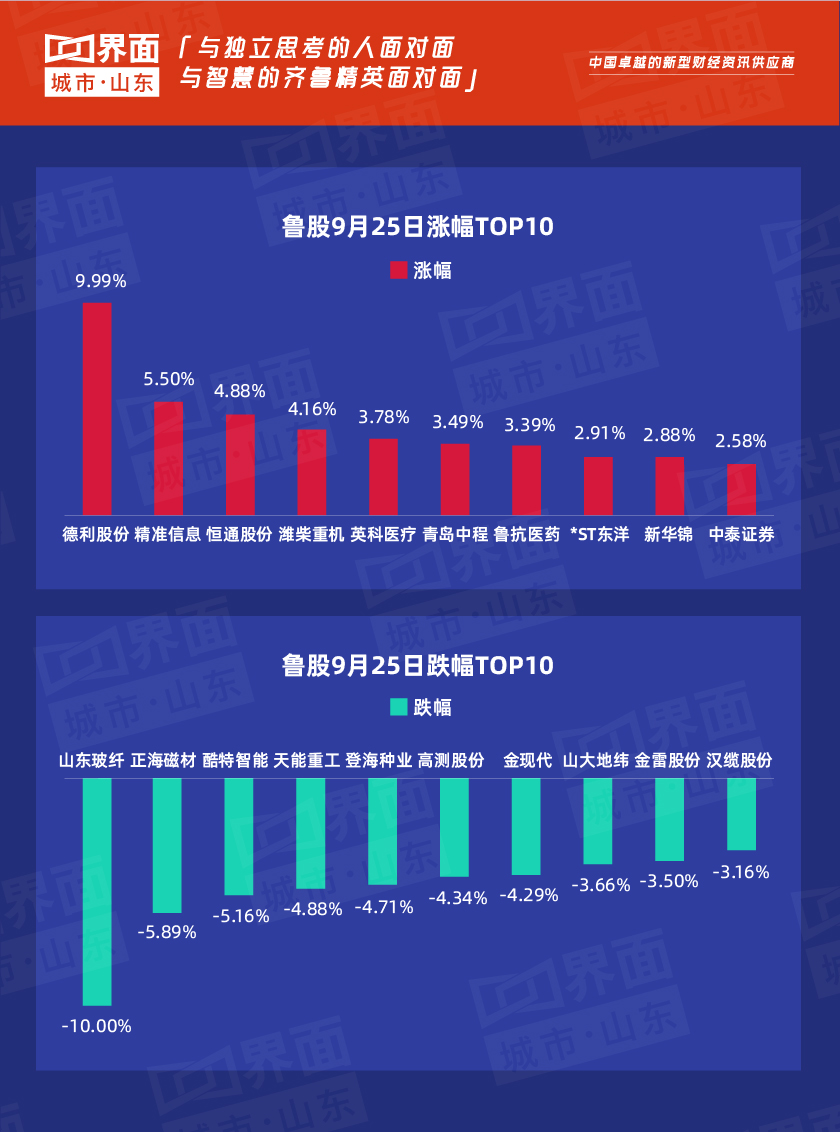 受大盘影响,9月25日,山东80只个股上涨,133只个股下跌。