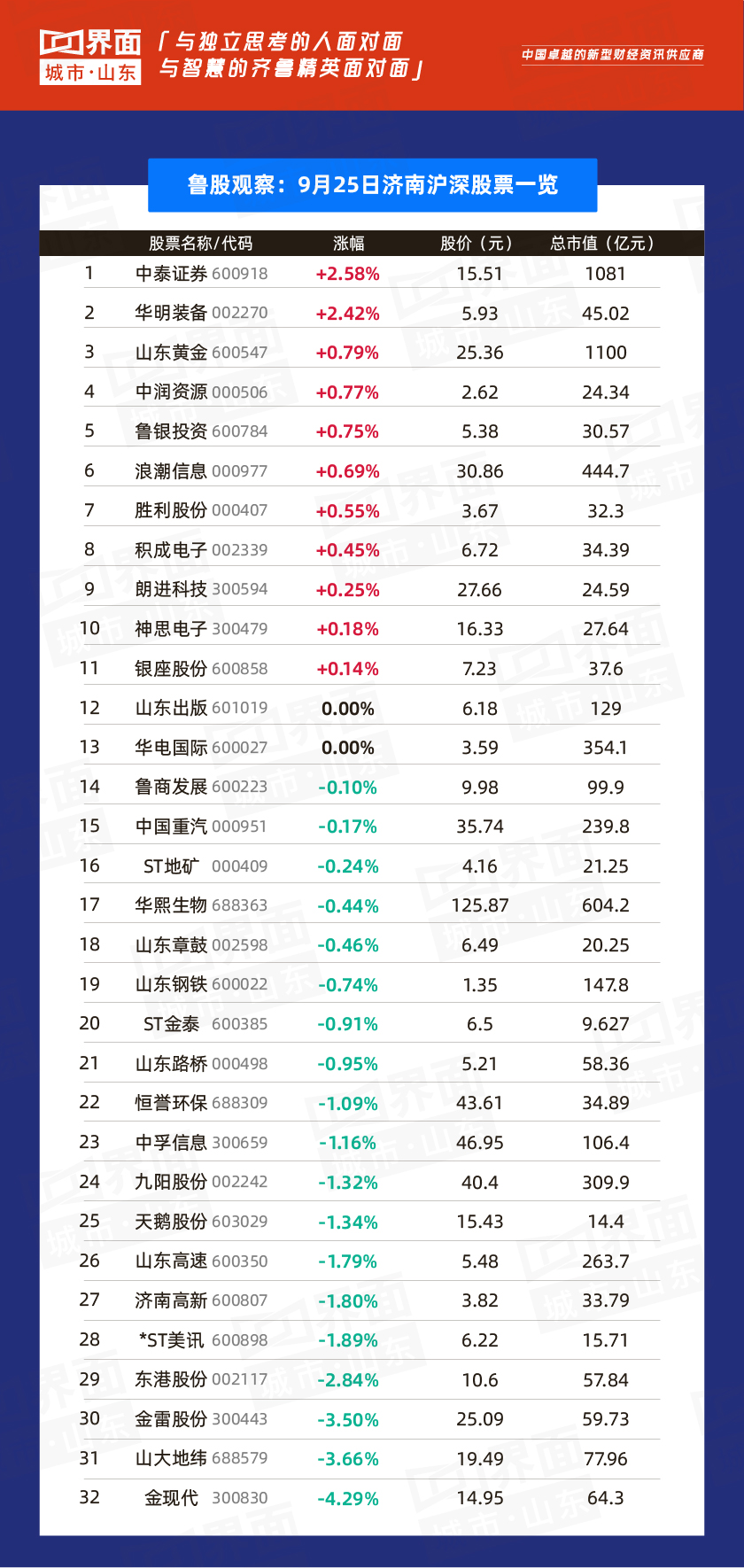济南市涨幅榜首:中泰证券(600918),涨幅2.58%,股价15.51元,总市值1081亿元;