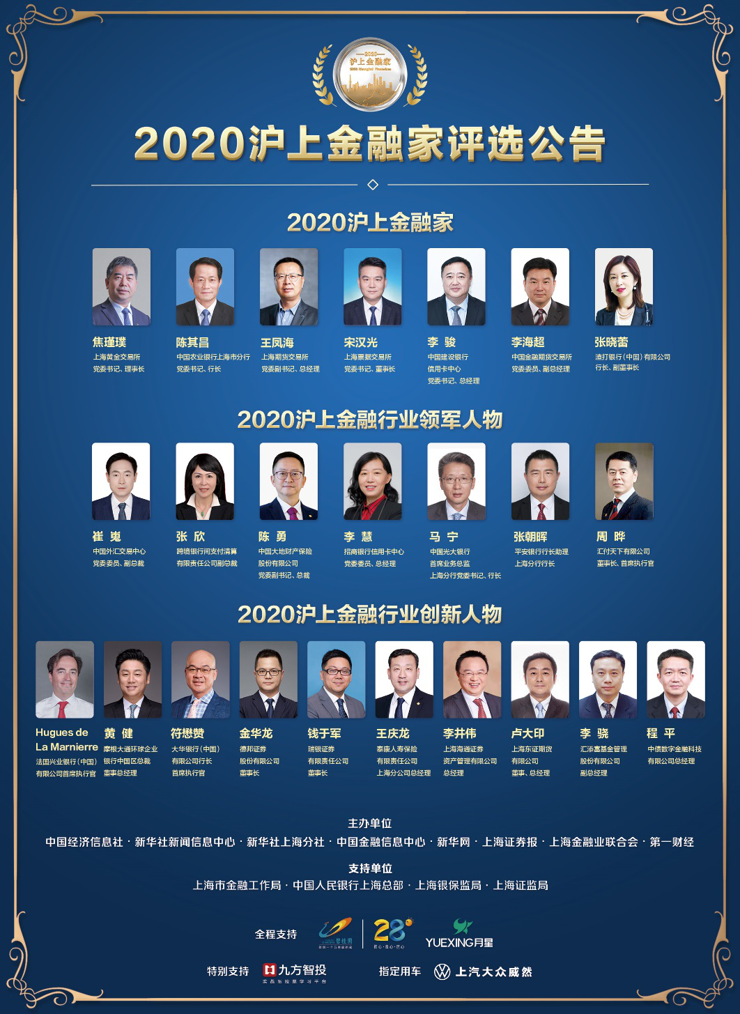2020年9月25日,连续第十年举办的金融界年度盛典“沪上金融家”评选结果揭晓,24位上海金融英才脱颖而出,分获“2020沪上金融家”“2020沪上金融行业领军人物”“2020沪上金融行业创新人物”三大奖项。