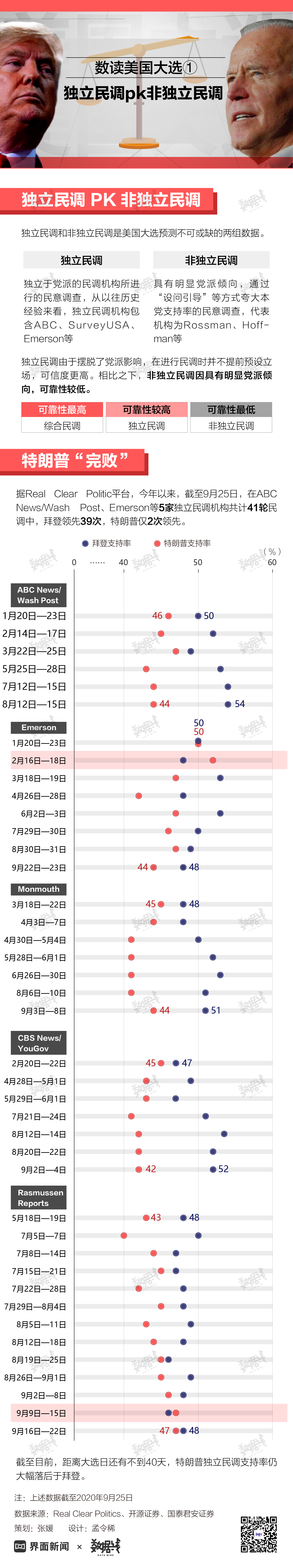 5家独立民调机构共计41轮民调,拜登领先39次,特朗普仅领先2次。