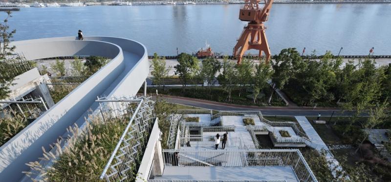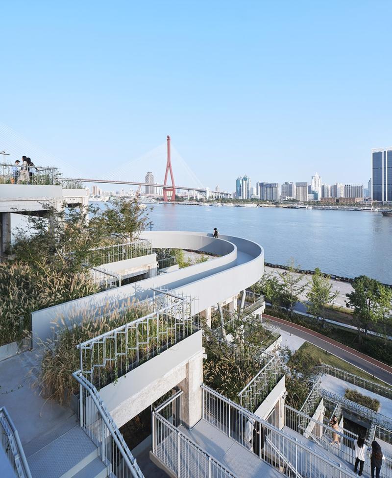 杨浦滨江南段,有一座奇怪的建筑。外面看是一座种满垂直绿化的阶梯状空中花园,内部有一条双螺旋楼梯贯穿上下。穿行于其中,每走一步都有惊喜。沿着楼梯走到屋顶,一个环形游廊悬在空中,黄浦江景尽收眼底,而脚下就是流淌的江水。