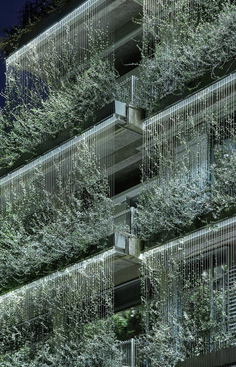 除了地被观赏草和灌木种植,绿之丘种植了大量乔木,这是为了让不同季节到访的人创造不一样的新鲜体验。每层退台用鸡爪槭,树型相对舒展,增加立面种植层次。中庭选取了丛生朴树,都属于落叶乔木,秋天会有迷人的相色变化。东西立面外层表皮采用了索网体系,设置爬藤索、种植箱体配合攀爬植物形成朦胧的界面,种上生命力较强的风车茉莉,到了7月花期,星布盛开的白色小花令人耳目一新。而到了晚上,垂直索顶布置的泛光照明使得光与植物形成呼应,更赋予了整座建筑随季节变化的不确定性。