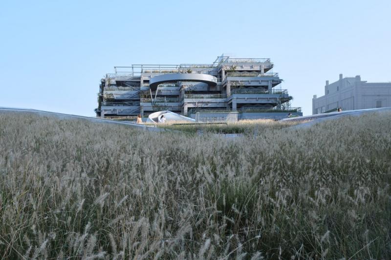 面向江面的梯状山丘形态,就像一个大型看台,人在看台上看江,打破了建筑孤立的状态,让绿之丘与环境产生更多交流。梯级状的绿化平台就像一个个绿色托盘,托起一颗颗珍珠。景观主体以狼尾草为基础野趣格调,从设计之初就避开走精致审美的路线。为了结构对称,建筑背面也做成了阶梯,种植垂直绿化,如同一座古巴比伦空中花园。