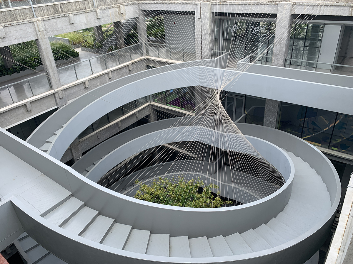 走进绿之丘内部,仿佛置身于另一个世界——外部的“方”线条变成了内部的“圆”。建筑中心楼板被上下打通,将天光引入内部,双螺旋楼梯围绕着中庭的一棵树盘曲向上。“楼板内部过去十分幽暗,在建筑的中心、下穿城市道路的上方置入中庭,光线能穿透整个建筑,同时双螺旋楼梯起到了沟通各层的作用。”
