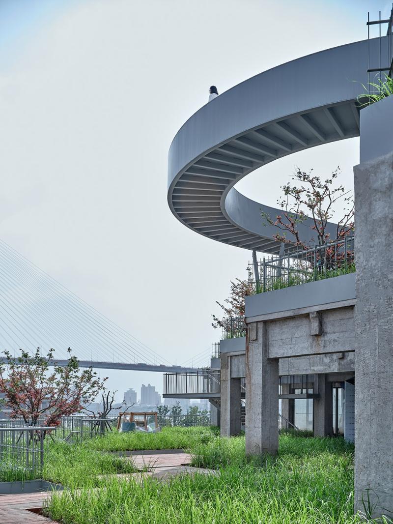 从一座遮挡物变成一座桥,城市道路从底下穿越,屋顶上又架一座桥,斜坡状的建筑无障碍地通向岸线,把城市和滨水空间连接在一起,这样的构筑物在滨江岸线上绝无仅有。人们由北坡屋面茂密的狼尾草中穿越,进入二层挑空的灰空间,再跨越市政道路,就能直达江岸,眺望和感受母亲河的朝夕。
