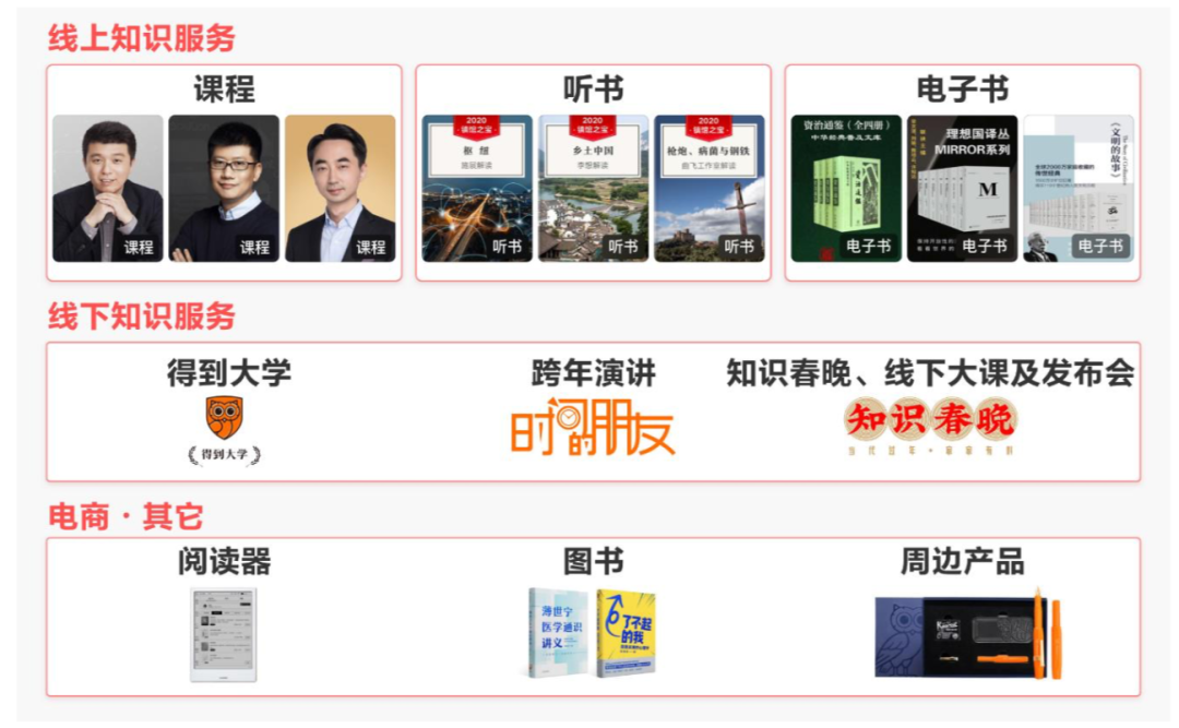 线上主要是“得到”App、“罗辑思维”微信公众号,提供课程、听书及电子书等产品。