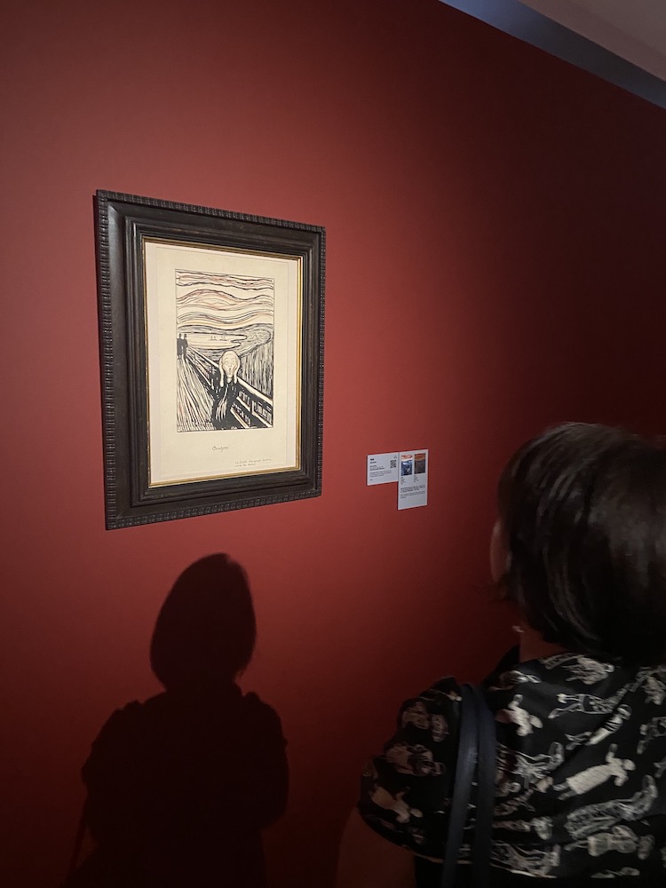 在展厅中,《呐喊》石版画被放置于一个单独开辟的空间中。昏暗的红色展墙将画作中人惊慌失措的压迫感更直观得带到了观众眼前。而在《呐喊》石版画旁,则是四幅《呐喊》彩绘画的图片介绍。