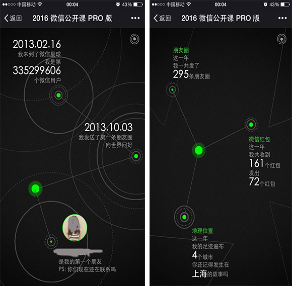 昨天晚上(1月10日),几个小时内朋友圈突然被“我和微信的故事”刷屏了,大家纷纷晒出了微信开通的时间,第一位好友是谁,2015年去过最远的地方,发出了多少条朋友圈,收发了多少红包等数据。