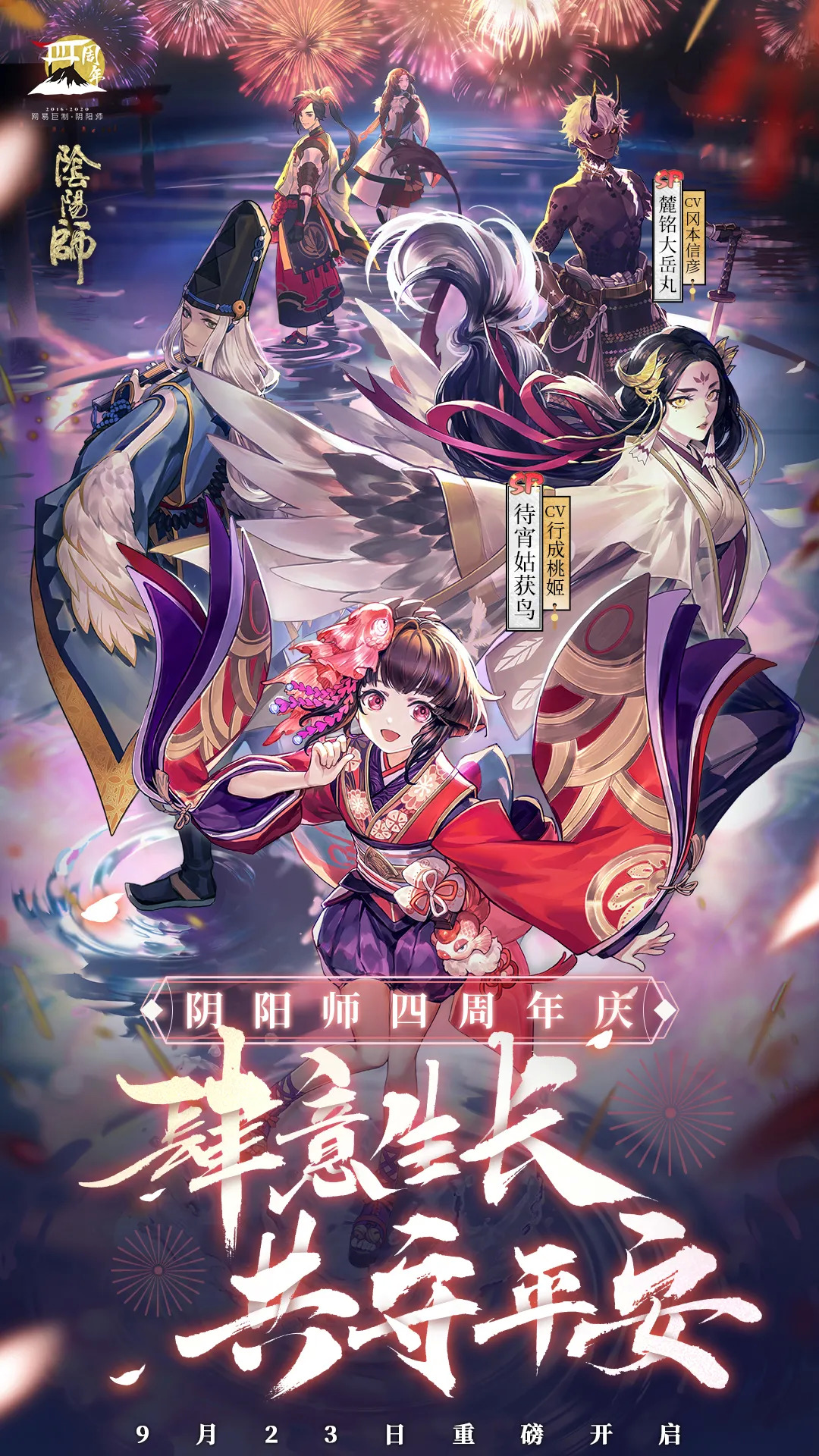 2020年9月23日,《阴阳师》四周年庆典正式开启,首日即登上iOS畅销榜第一。在这次周年庆中,《阴阳师》推出了双SP式神:麓鸣大岳丸和待宵姑获鸟,开启年度剧情新篇章“故海之约”,并上线全服超大型玩法“麓海归途”。此外还有游戏引擎美术升级、经典式神新皮肤、系列庆生福利活动,并发布了蜷川实花艺术跨界、肯德基品牌合作、世界自然基金会(WWF)、中国邮政限定礼盒、四周年音乐专辑等庆生内容。