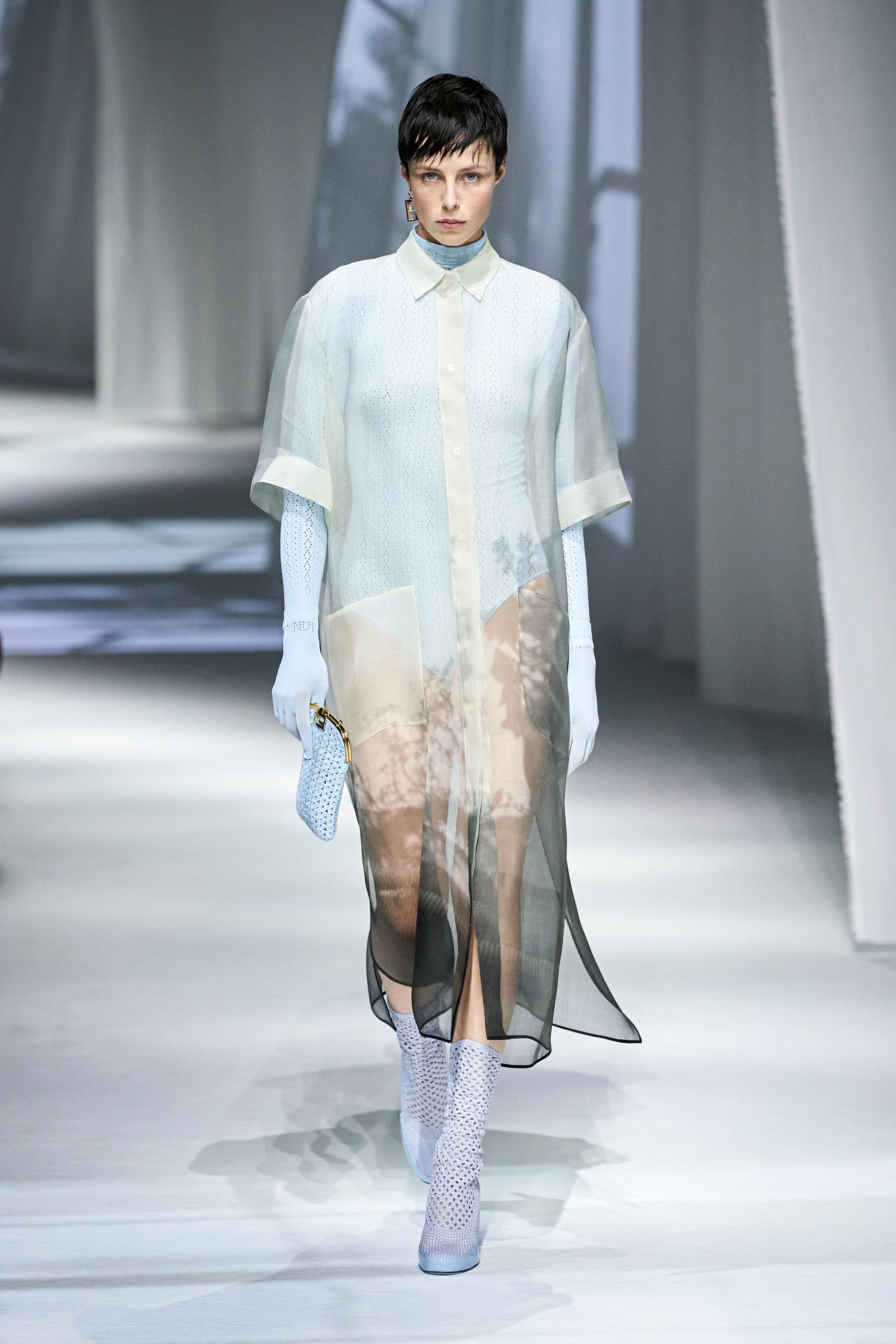 因此,我们可以在Fendi的2021春夏秀场上再度找到那些曾由Karl Lagerfeld和Silvia Venturini Fendi共同创作出的轻盈轮廓和雅致姿态。柔和的半透明浅色亚麻布被装饰上了需要工匠以极度精细技术来刺绣的花卉图案,它们与富有层次感的内外搭配和走路时随空气摆动的形状,一同展现出午后树影斑驳的光影效果。