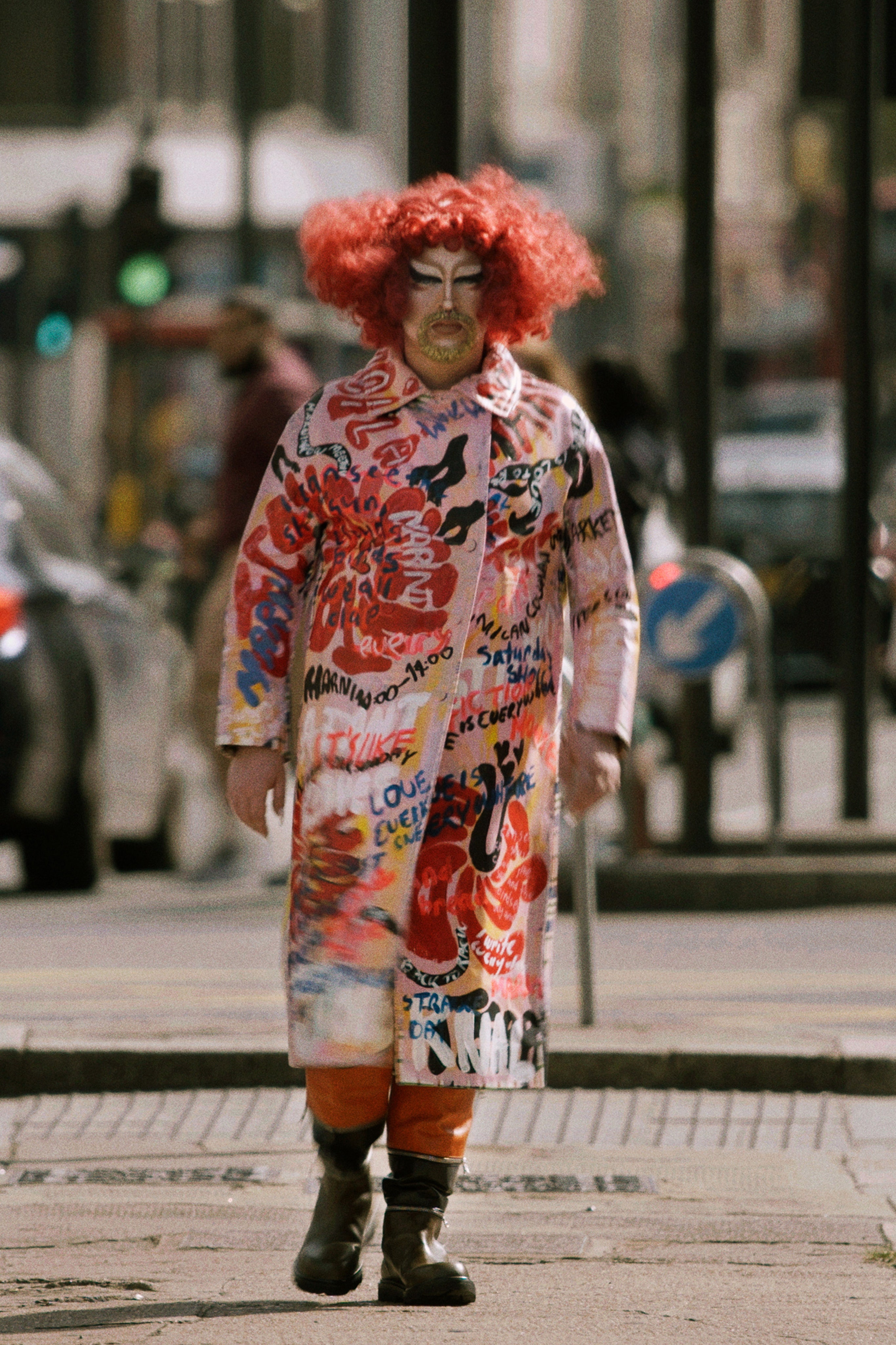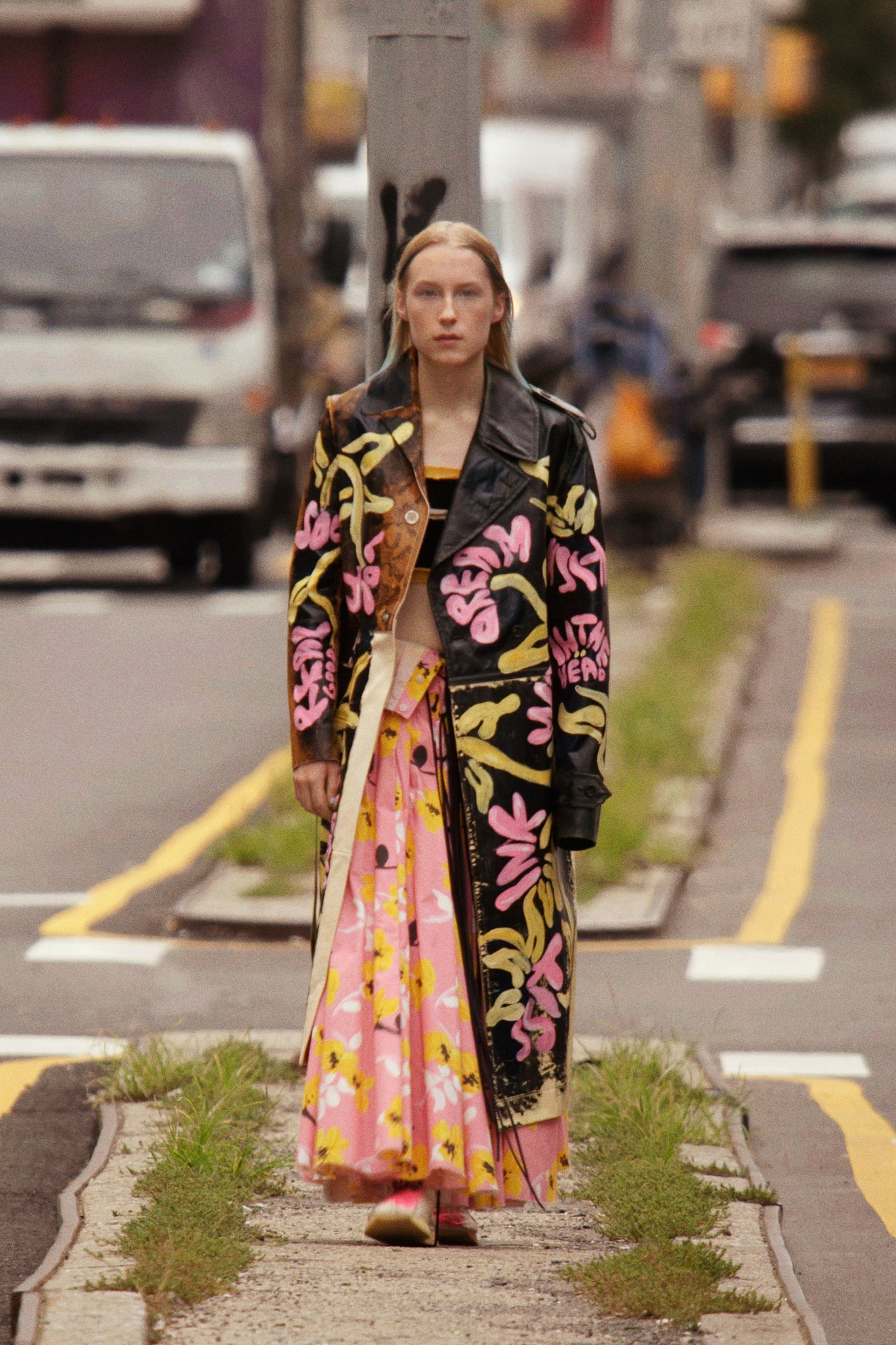 其中,涂鸦无疑是展现这种反叛意识和多元文化观的最有效的图样。Francesco Risso从Marni的档案中汲取灵感,将色彩斑斓且不为形态所束缚的涂鸦笔触绘画在服饰上,从带有少数民族宗教仪式感的血色鲜红,再到凸显街头文化的宣言字样,多文化的沟通在这里实现了某种形式上的平衡。