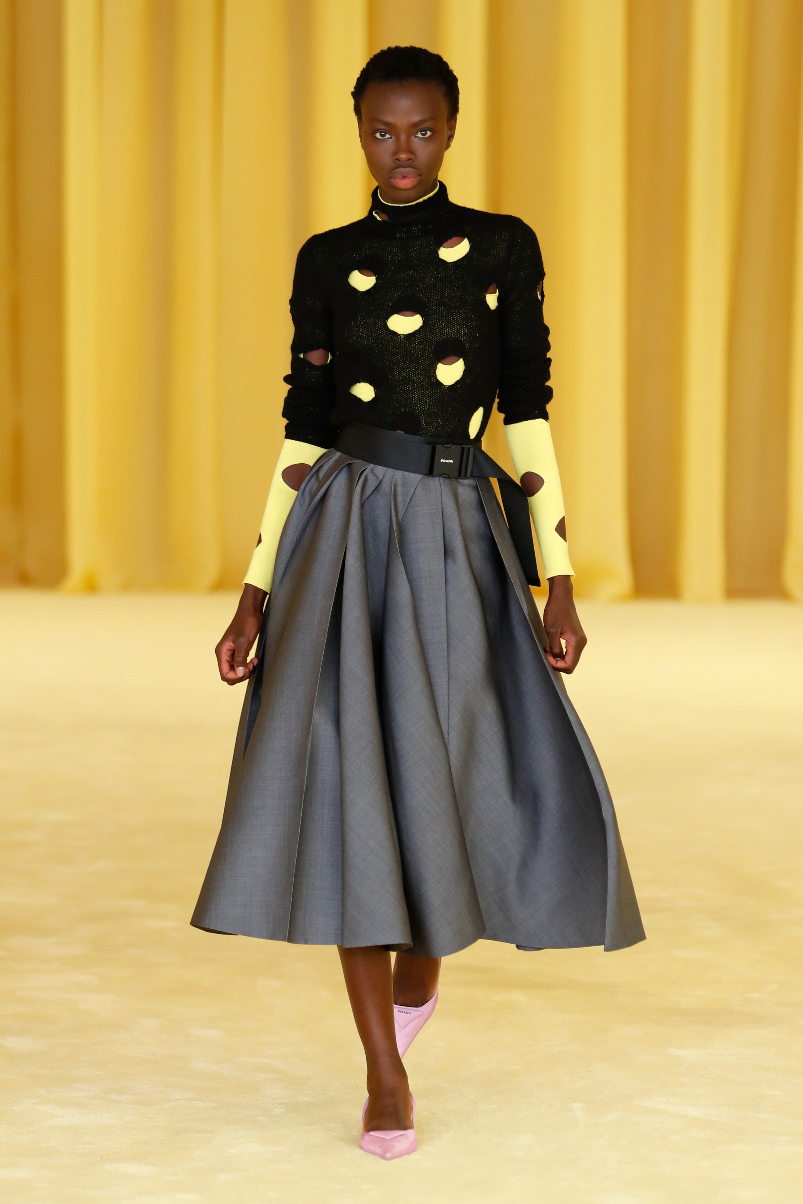 以往于Miuccia Prada设计中常见的明亮色彩在这一系列中同样也得到呈现。浅粉色、鹅黄色、浅草绿色在开场后逐一被展现,早前分别在1996春夏和1996秋冬系列中出现的两种方形印花也被装饰到了宽松的茧型裙装上。但在大秀的后半段,整体服饰的色彩由多元转向黑、白双色,与遍布秀场全方位无死角拍摄的摄像机共同描绘了一副置身于科技时代中的单调图景。