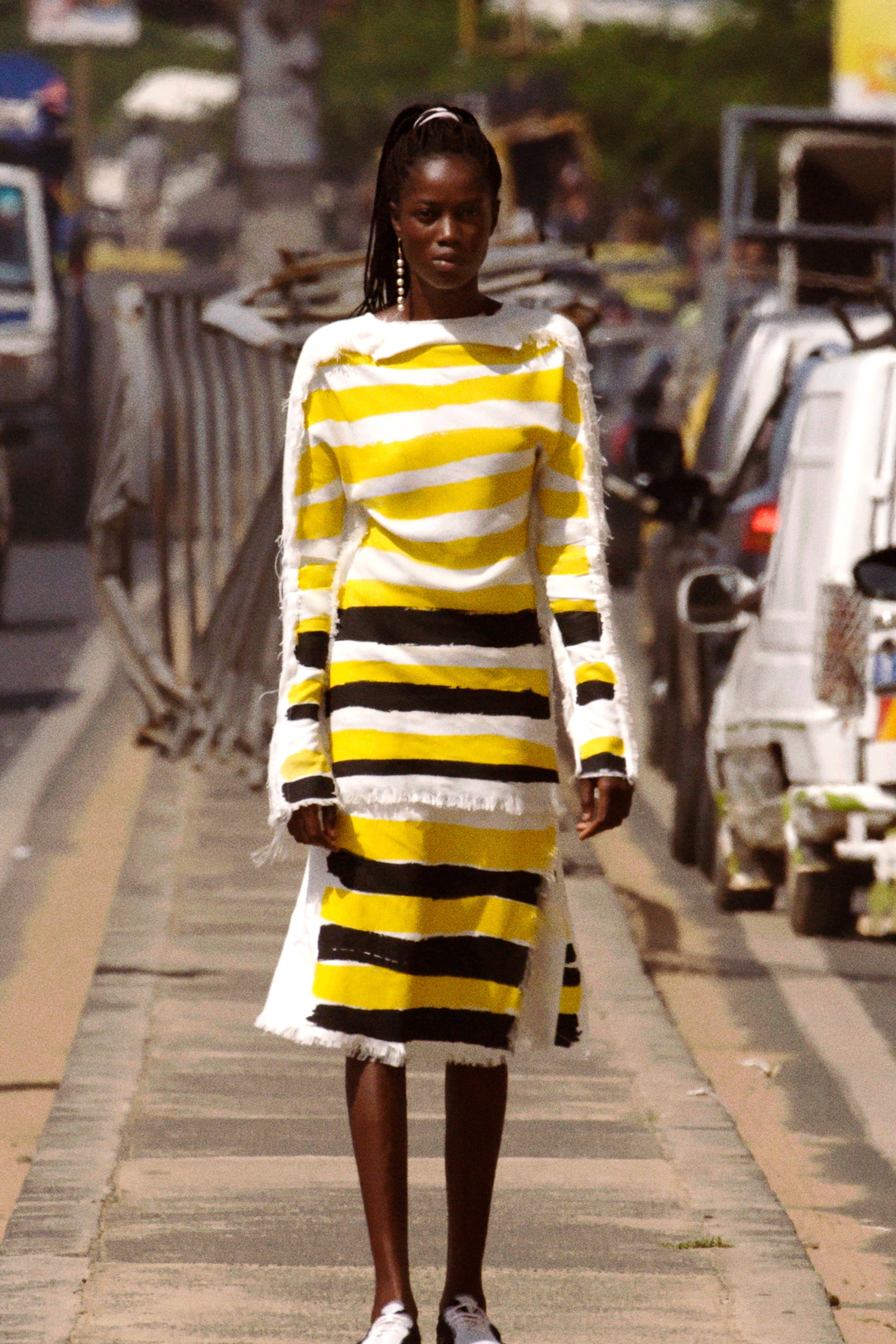 当然,极为精彩的解构主义廓形也不应被忽视,长短裙、撕裂的齐胸T恤、带有未完成特征的条纹连衣套装都为我们展现了Francesco Risso天马行空的想象力和强大的制衣技术,为一度略显老气的米兰时装周带来了新的活力。