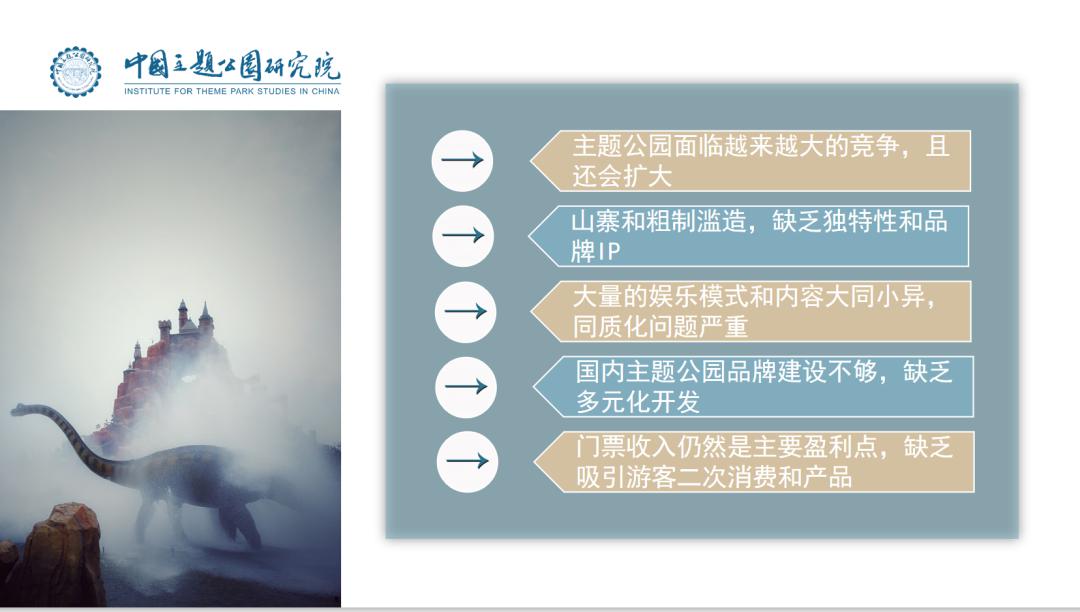 首先,国内主题公园现在面临的竞争压力是越来越大,而且还在扩张,长三角目前是中国主题公园数量最多、产品质量最好的一个区域,有迪士尼、方特、华侨城、宋城、横店、恐龙园,竞争非常激烈;第二,山寨和粗制滥造,缺乏独特性和品牌IP;第三,大量的娱乐模式和内容大同小异,同质化问题严重;第四,品牌建设不足,缺乏多元化发展;第五,门票收入仍是主要盈利点,缺乏吸引游客的二次消费和产品。
