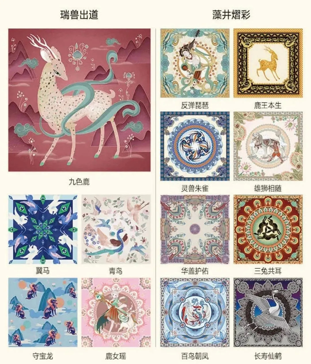 当时,鹅厂设计师从莫高窟的藻井壁画中获得灵感,创作了 “敦煌诗巾”。时至今日,除了之前的8个图案,又新增了九色鹿、翼马、青鸟、守宝龙四个瑞兽主题,据说都取自于敦煌石窟的壁画,是希望把传统的文化艺术,通过数字化和新文创的方式,带到大家面前。
