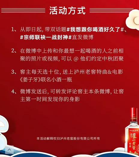 其一,《姜子牙》本身讲述的是植根中国土壤的历史文化故事,带有浓重的文化色彩,能够使身为中国老字号的品牌之一的泸州老窖特曲与之碰撞而不显得突兀,反而能成倍扩大双方的粉丝受众。其二,泸特在“双节”到来之际与国漫大IP共同进退,不仅能占据行业热点、收割流量,还能提前营造团圆饭氛围,抢占中秋档。
