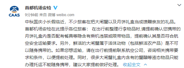 首都机场安检官微9月27日消息,中秋国庆小长假临近,不少旅客在把大闸蟹以及月饼礼盒当成馈赠亲友的礼品。首都机场安检在此提示各位旅客: 在出行前整理行李物品时,请提前确认您携带的月饼礼盒内是否配有餐具等隐含有乘机违禁或限带物品,提前确认其是否符合航空安全运输要求。另外,鲜活的大闸蟹属于活体动物(包括鲜活农产品)是不可以随身携带的。如果您想运输,请在出行前提前联系航空公司,咨询相关携带要求和条件,以便提前处理。同时,很多大闸蟹礼盒内含有的蟹醋等液态物品只能办理托运不能随身携带,建议大家提前做好处理。
