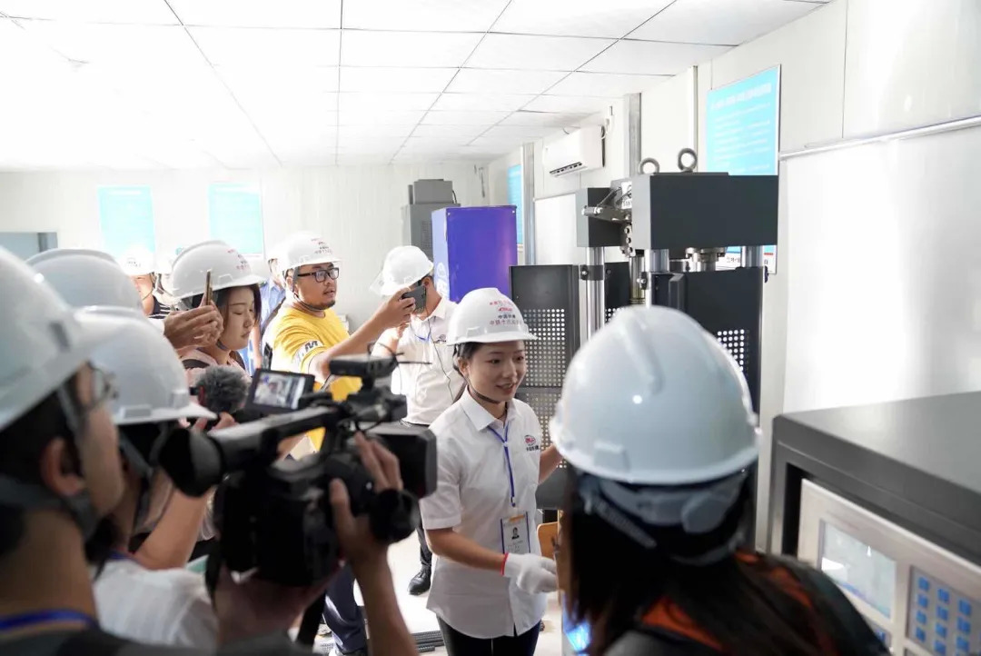 在钢筋检测室,发现团遇到了一位正在对钢筋进行检测的小姑娘,她叫李怡,是一名刚毕业不久的大学生。她给大家演示,把制好的钢筋放进机器中,钢筋必须经受住强度大于540兆帕的力,才能用于制造梁体。看完试验后,发现团成员纷纷为高铁建设者点赞。