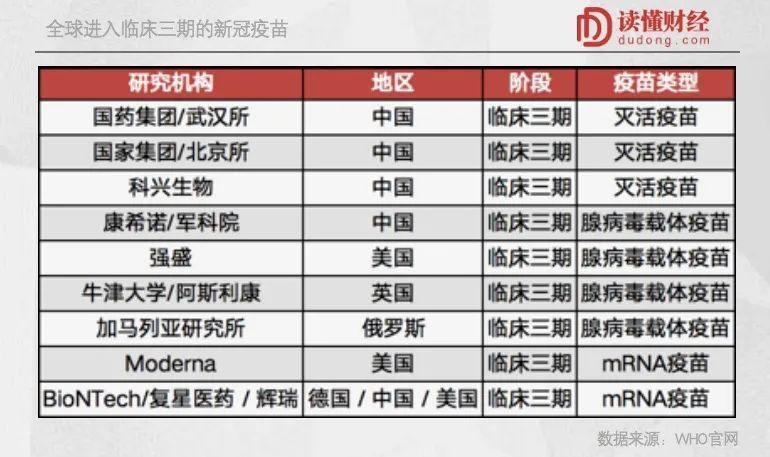 据WHO数据,目前全球有9个新冠疫苗进入临床三期。这9个进度领先的疫苗,无疑最有看头。
