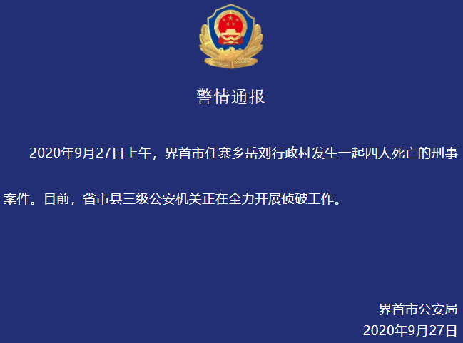 界首市公安局微信公号消息,2020年9月27日上午,界首市任寨乡岳刘行政村发生一起四人死亡的刑事案件。目前,省市县三级公安机关正在全力开展侦破工作。