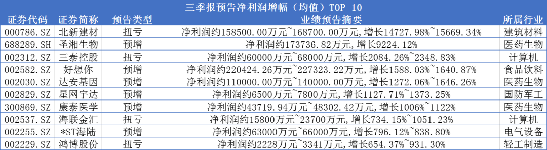 从净利润增幅来看,北新建材、圣湘生物、三泰控股分列冠亚季军,三季报预告净利润增幅均值分别为152倍、92倍和22倍;排名前十的上市公司中医药生物行业夺得三个席位,分别是圣湘生物、达安基因、康泰医学。