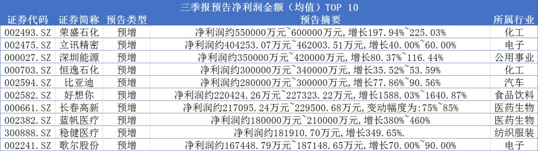 从净利润金额来看,荣盛石化、立讯精密、深圳能源则斩获前三,三季报预告净利润均值分别为57.5亿、43.3亿和38.5亿元;医药行业的长春高新和蓝帆医疗同样挤进前十,预计净利润分别达到22.3亿和19.5亿元。