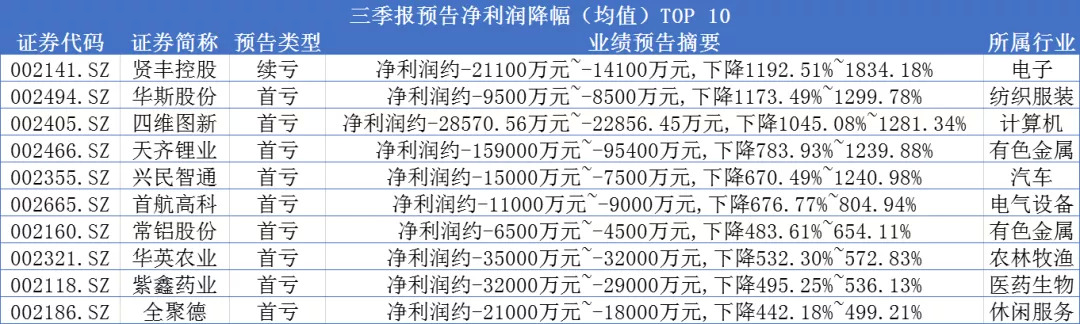 净利润降幅最大的前十个股中,除贤丰控股外其他个股均为首次出现亏损。净利润降幅最大的为贤丰控股、华斯股份、四维图新,分别属于电子、纺织服装和计算机行业,三季报预告净利润降幅均值分别为15倍、12倍和11.6倍。