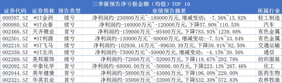 而从亏损金额来看,亏损严重的个股集中在ST股中,*ST金洲预计净亏损约20.5亿元,而*ST众泰、*ST利源净亏损均超过10亿元,均为连续亏损的个股。据时代财经统计,截至9月27日,已有58只ST股披露三季报预告,其中预悲的有41只,占比高达71%。
