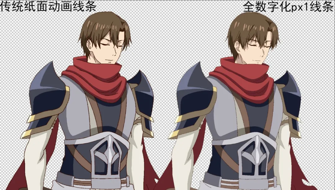 相比之下,之前特别篇作画素材是用720P的标准画面,素材的分辨率只有1280 × 720,与常规的二维日式TV动画是同一标准。第二季的制作开始的时候,考虑到全职的人物,特效,道具等细节需求的精细度更高,把素材标准提升到了1080P,画面细节的表现大幅上升。此外,本季所有的线条,均采用软件中最细的1号线为制作动画的素材,即一个像素的线条,在观感上会非常细致,后期处理的宽容度也相对更高。