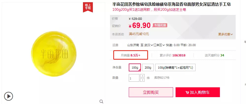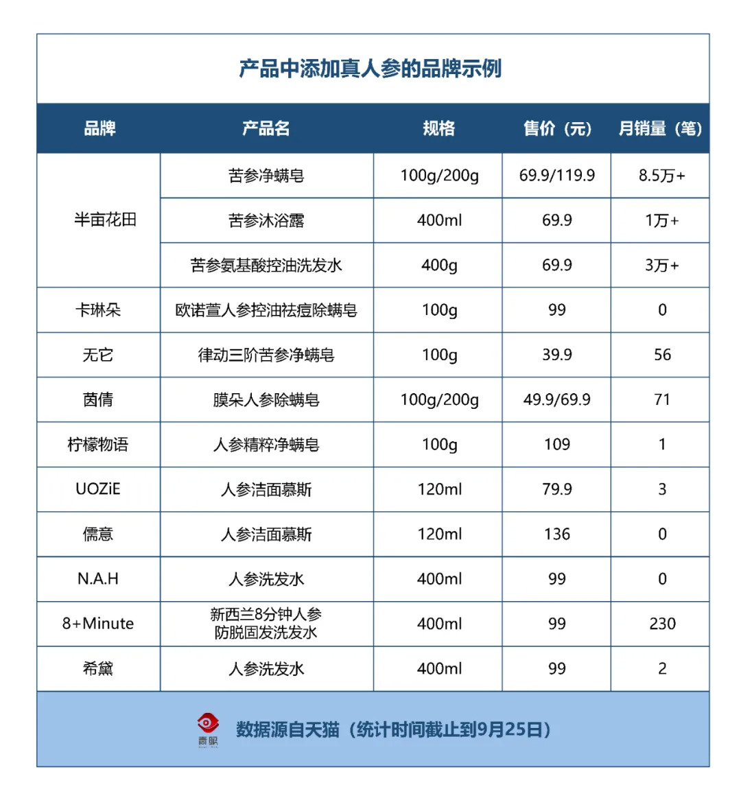 青眼梳理这些“泡着人参”的化妆品发现,在这之中,除了半亩花田表现尚可,其他品牌产品销量寥寥。以半亩花田的一款苦参净螨皂为例,其主要成分即是苦参碱,产品中就包裹着一根人参,客服称系“长白山人参”,显示月销量为8.5万+。这不禁让人怀疑,真有这么多长白山人参给他们加在肥皂里吗?而另外4个品牌的同款皂类产品处境尴尬,月销量均未过百。
