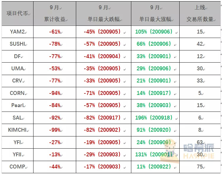 虽然后续出现交易所入局DeFi、新币开挖、SUSHI以1400美元回购代币等等利好消息,但市场热度大不如前。月初至今,除了YFI、YFII以及COMP之外,各主打流动性挖矿的DeFi项目都未能逃脱价格腰斩的命运,相关代币单日最高跌幅达82%。