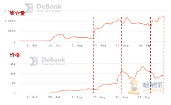 近三个月来yearn.finance的锁仓量及价格变化情况(数据源自:DeBank)
