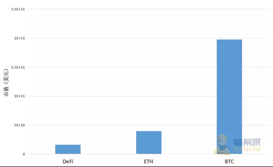 DeFi项目、比特币以及以太坊的总市值比较(数据源自:DeBank,Coinmarketcap)