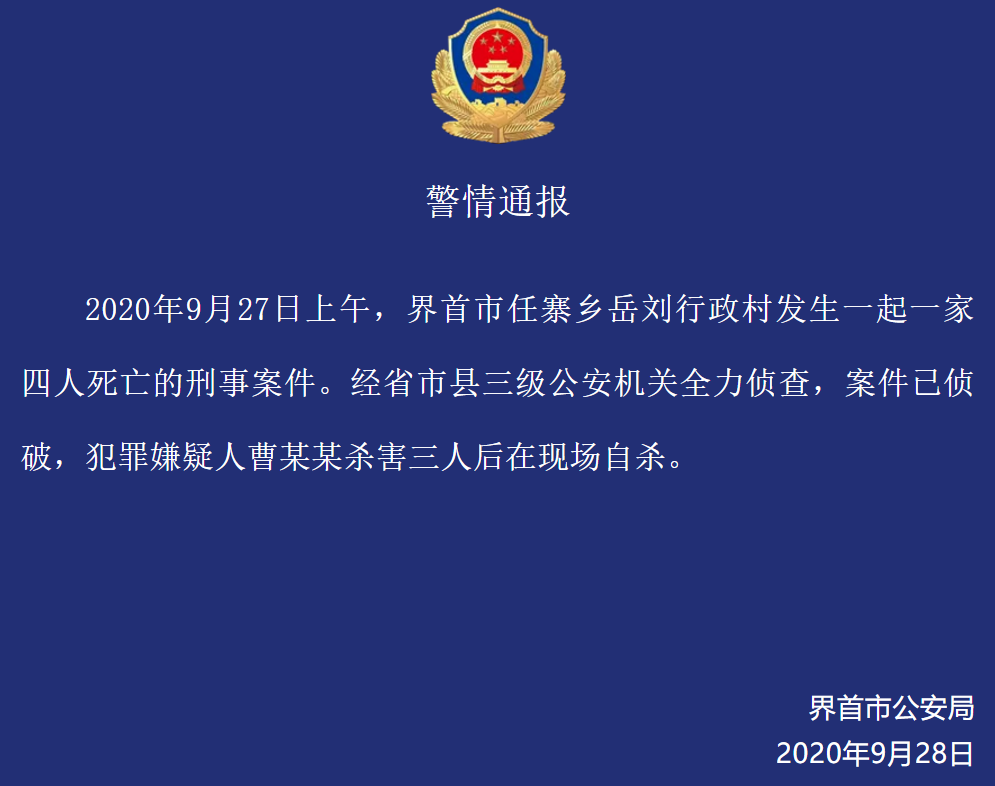 平安界首微信消息,2020年9月27日上午,界首市任寨乡岳刘行政村发生一起一家四人死亡的刑事案件。经省市县三级公安机关全力侦查,案件已侦破,犯罪嫌疑人曹某某杀害三人后在现场自杀。