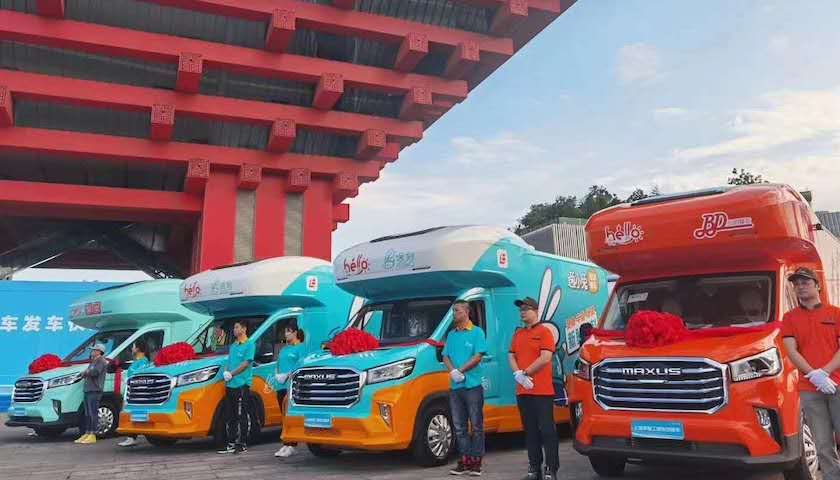 2020年9月28日早上,来自光明良友、百联逸刻、粮全其美、盒马、中饮巴比等5家企业的首批流动餐车集体发车,驶向街头。