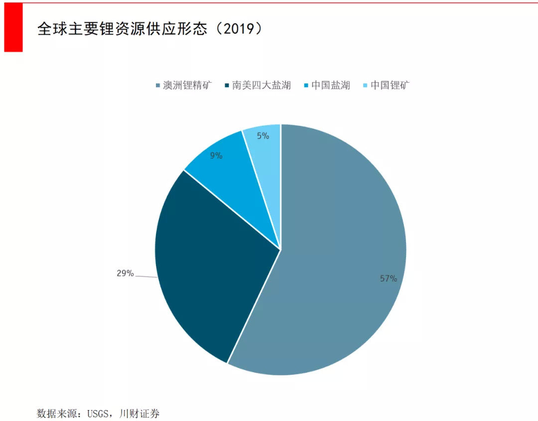 锂主要存在于两种地方:盐湖和锂矿山。按全球的供给量来看,澳洲锂矿占50%,南美盐湖占40%,中国的盐湖和矿山共计10%。