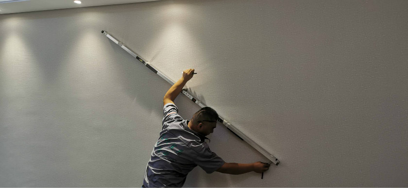 经过检测发现,房屋的垂直度和层高没有太大问题,但是客厅墙面、地面的平整度都超过了国家的相应标准。特别是客厅墙面,因为铺有壁布,所以在射灯的照射下墙面的问题很明显,在用专业标尺测量之前,业主就发现了问题。