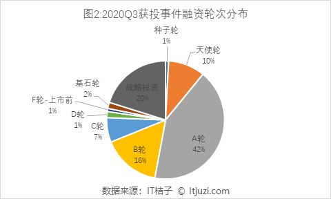 2020 年第三季度大多数融资事件处于早期融资阶段,其中种子轮、天使轮、A 轮融资事件共 63 起,占比 53%;B 轮、C 轮融资事件共 27 起,占比 23%;战略投资 24 起,占比 20%。