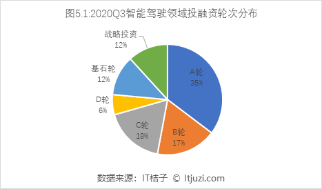 2020 年第三季度智能驾驶领域共发生 17 件投资,主要集中在 A-C 轮。其中 A 轮投资事件占比 35%,B 轮、C 轮占比 36%。
