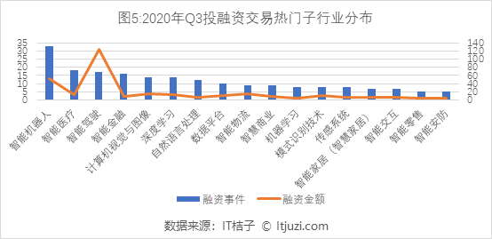 2020 年第三季度,获投事件数最多的子行业是智能机器人,其次是智能医疗、智能驾驶、智能金融、计算机视觉与图像、深度学习、自然语言处理、数据平台等;获投金额最多的子行业是智能驾驶、智能机器人、计算机视觉与图像、智能物流、智能医疗、深度学习、模式识别技术、数据平台等。下面对吸金能力较强的子行业进行分析。