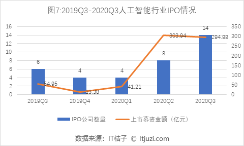 2020 年第三季度全国共有 14 家公司 IPO 上市,募资金额共 294.98 亿元;五个季度以来,今年第三季度 IPO 上市事件数量大幅提高,募资金额也呈现上升趋势。科创板对于 AI 硬科技类、AI 医疗类公司的上市仍表现出极大的热情。