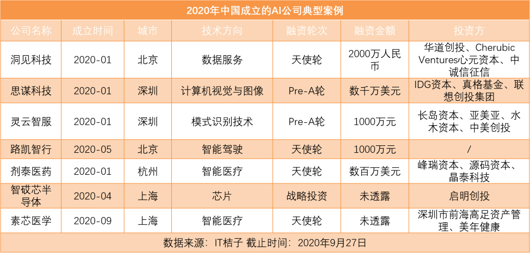 其中 2020 年成立并且获得融资的公司有 7 家,包括专注工业检测与高清视频的思谋科技获得了 IDG 资本等数千万美元 Pre-A 轮投资;上海的芯片企业智砹芯半导体在 4 月获得了启明创投的战略投资;智能医学影像技术研发商素芯医学在 9 月获得了深圳市前海高足资产管理和美年健康天使轮融资。