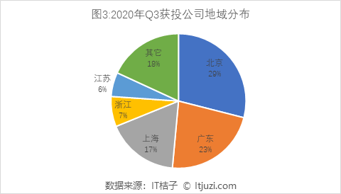今年第三季度我国人工智能行业有 117 家公司获得融资。获投公司前五的省市分别为北京、广东、上海、浙江、江苏,其中北京占比 29%,广东占比 23%,上海占比 17%,浙江和江苏分别为 7% 和 6%。