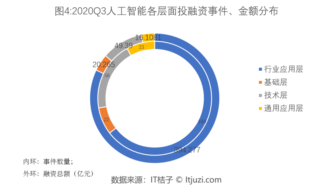 IT 桔子将人工智能第一层级分为基础层、技术层、行业应用层、通用应用层。2020 第三季度基础层融资事件 22 起,占比 8%,融资金额仅占 4%;技术层融资事件 56 起,占比 20%,融资金额占 10%;占比同样偏少的还有通用应用层,融资事件 23 起,基本与基础层持平,但融资金额更少,只有 16.3 亿人民币,占比约 3%;相比之下,行业应用层无论在融资数量还是金额上体量都最大,其中融资事件 184 起,占比 65%,融资金额 394.3 亿元,占比 82%,吸金能力最强。